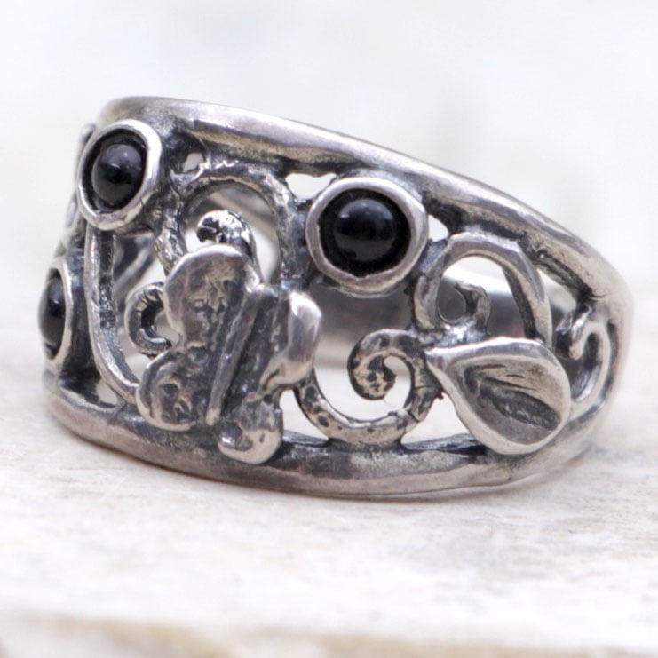 טבעת כסף 925 מעוצבת פרפר ומשובצת אבני אוניקס (BLACK ONYX). מידה 7.5.