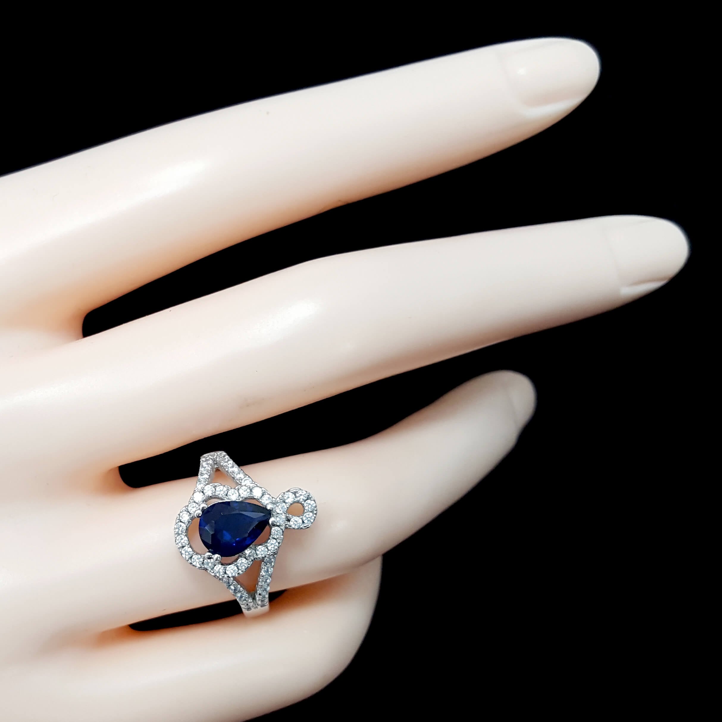 טבעת כסף משובצת אבן זרקון כחולה בצורת טיפה וזרקונים קטנים נוצצים (BLUE, WHITE CZ).
