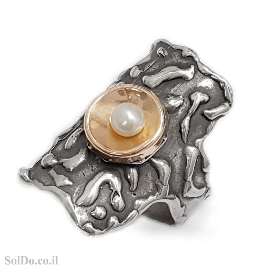 טבעת מכסף מעוצבת משובצת פנינה לבנה ושילוב ציפוי גולדפילד.