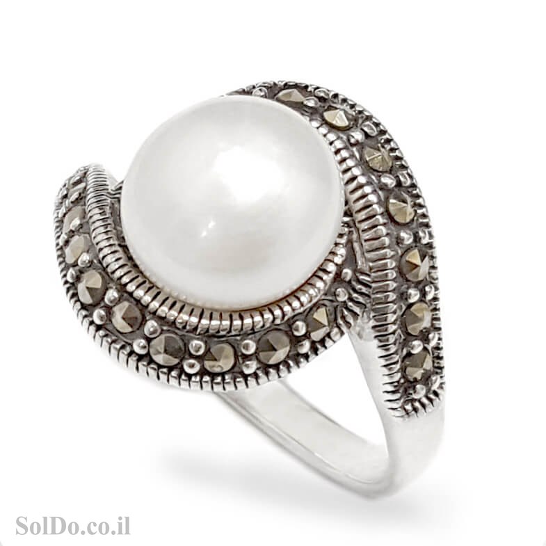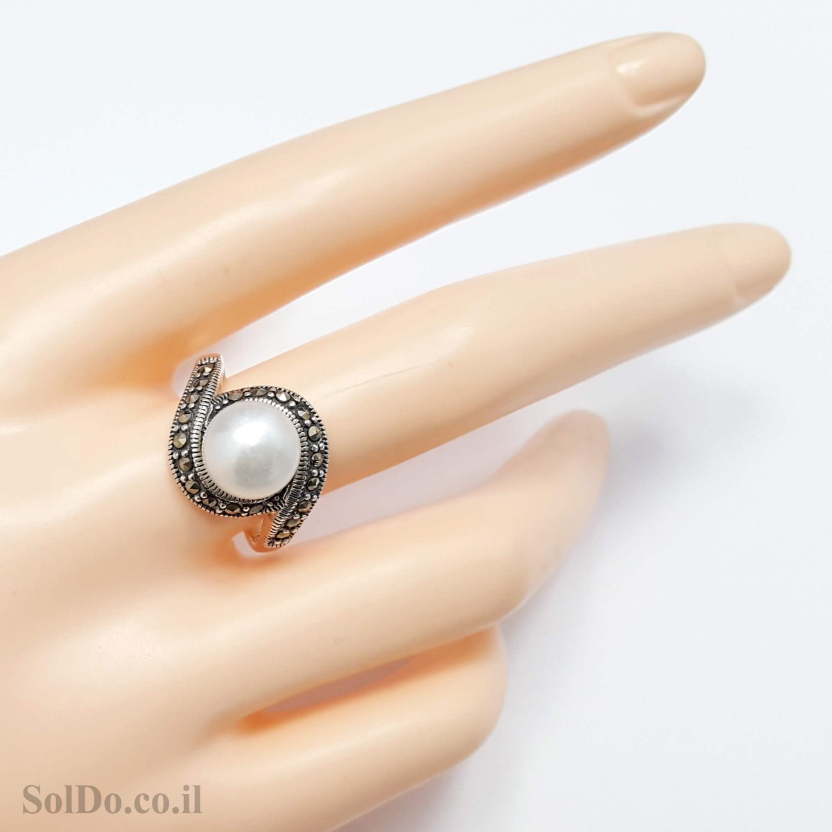 טבעת מכסף משובצת פנינה לבנה (PEARL) ומרקזטים.