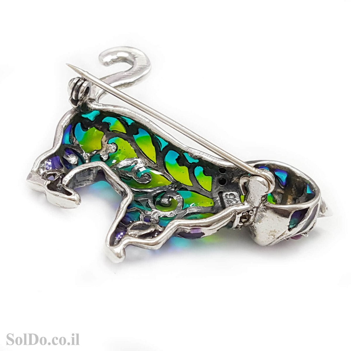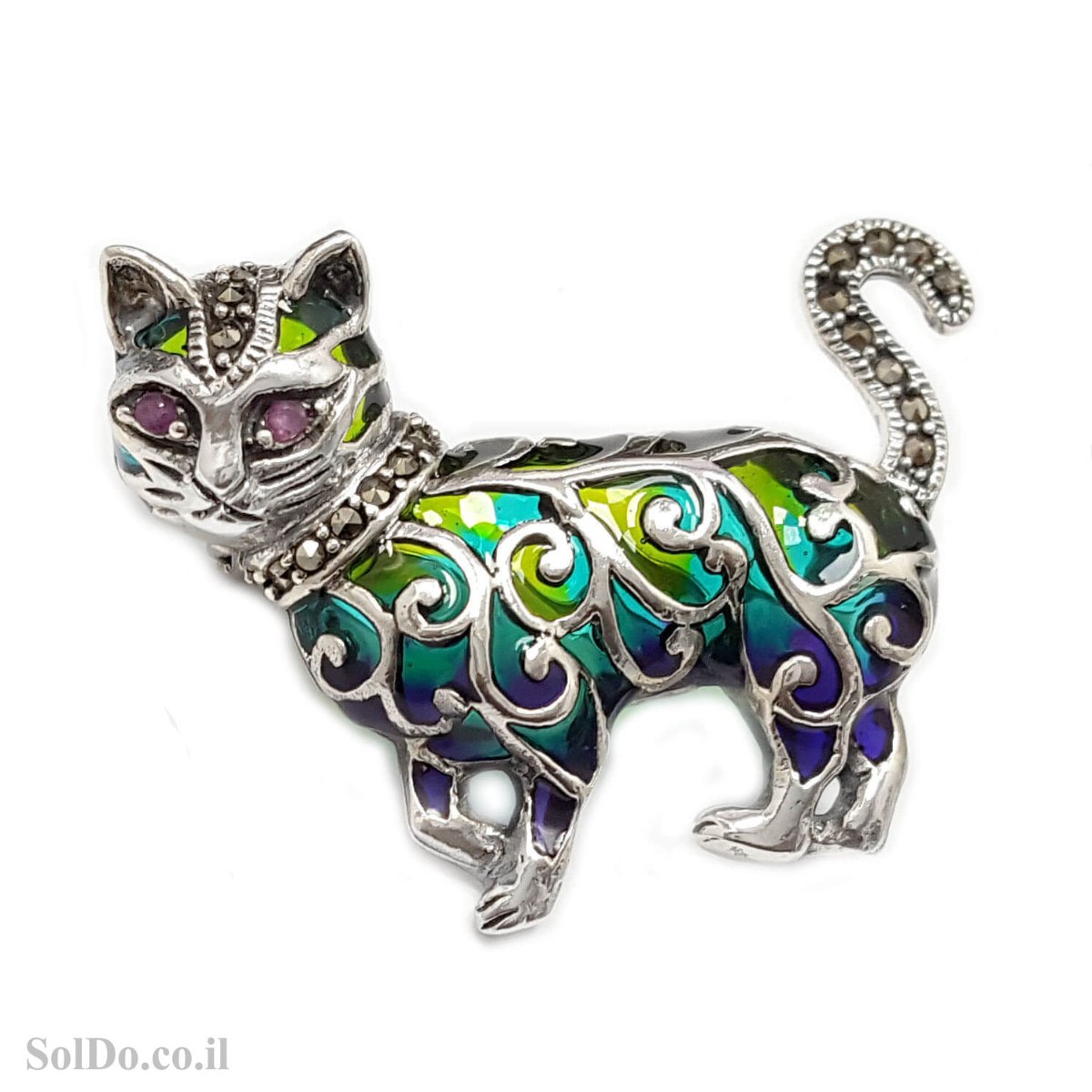 סיכה מכסף מעוצבת דגם "חתולה" משובצת מרקזטים ואמייל צבעוני T6191 | תכשיטי כסף