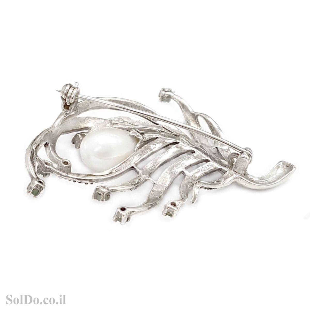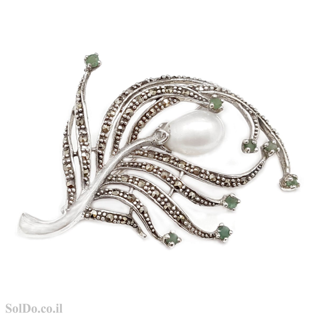 סיכה מכסף מעוצבת משובצת מרקזטים, אבני אמרלד ופנינה לבנה T6189 | תכשיטי כסף