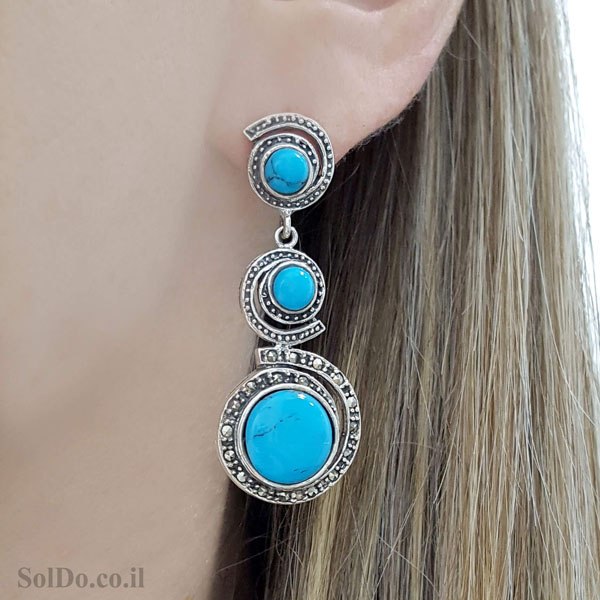 עגילים מכסף ארוכים משובצים מרקזטים ואבני טורקיז (TURQUISE).