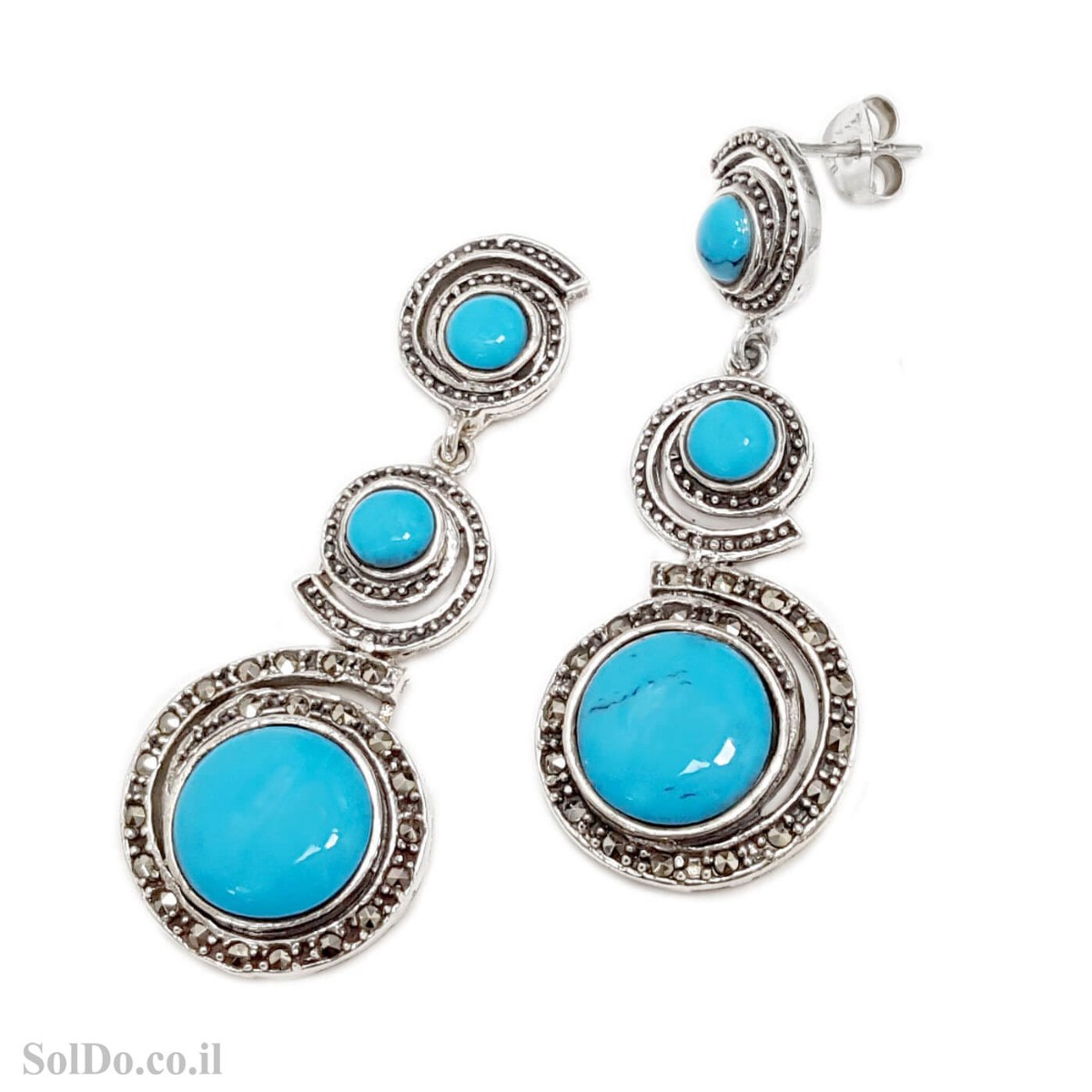 עגילים מכסף ארוכים משובצים מרקזטים ואבני טורקיז A8988 | תכשיטי כסף 925 | עגילי כסף