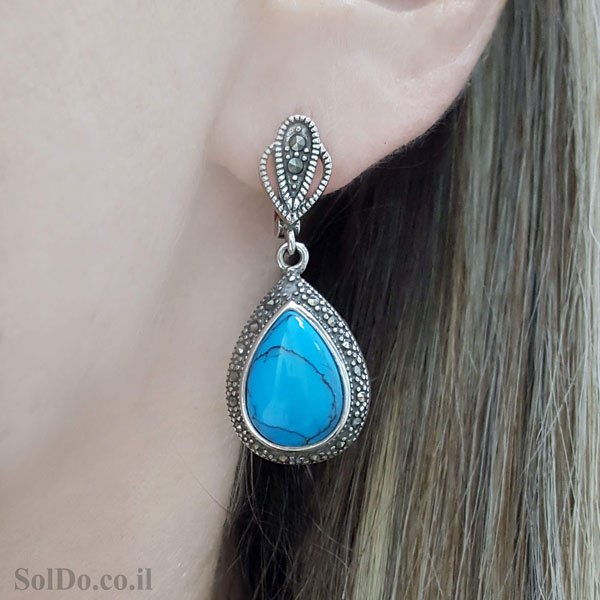 עגילים מכסף תלויים משובצים מרקזטים ואבני טורקיז  (TURQUISE).