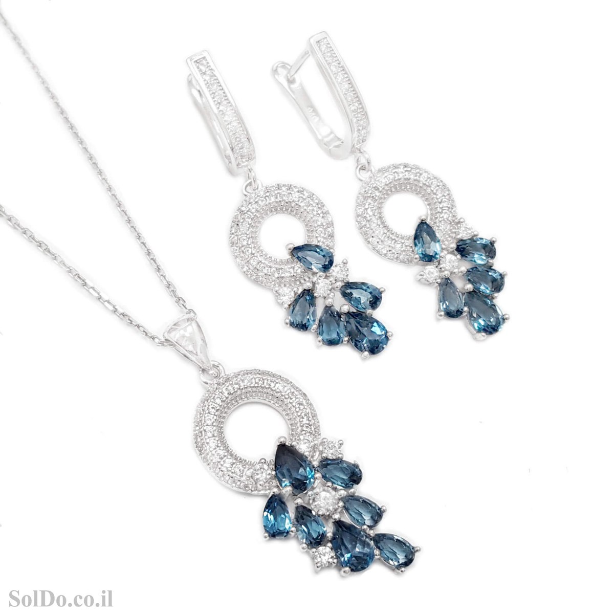 עגילים תלויים ותליון מכסף משובצים אבני טופז כחולה ואבני זרקון S1737