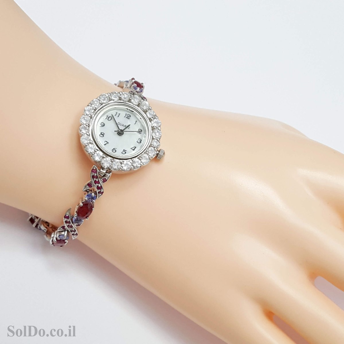 שעון מכסף לאישה משובץ אבני רובי, טנזנית ואבני זרקון.
