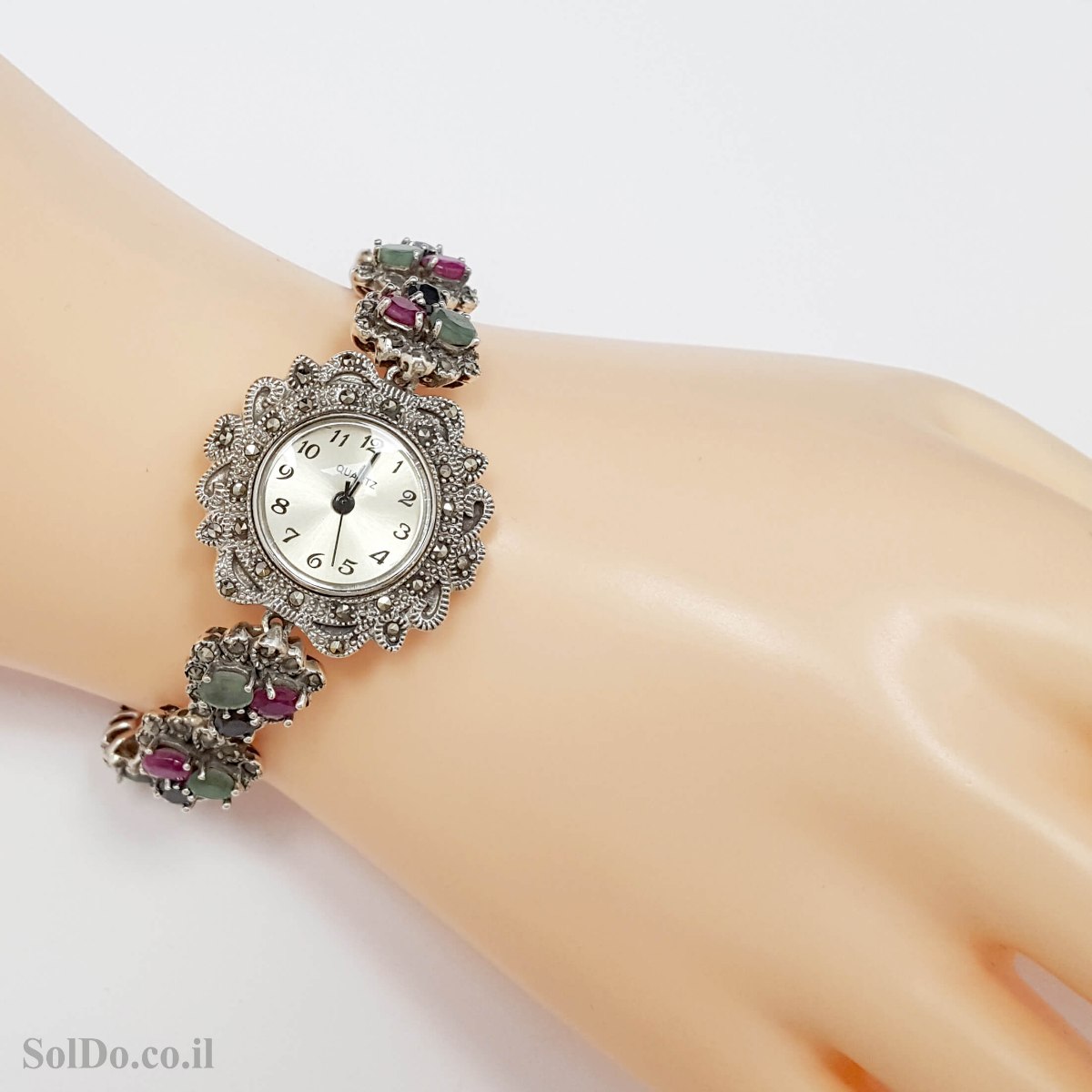 שעון מכסף מעוצב משובץ מרקזטים ואבני אמרלד, רובי וספיר SH3265 | תכשיטי כסף