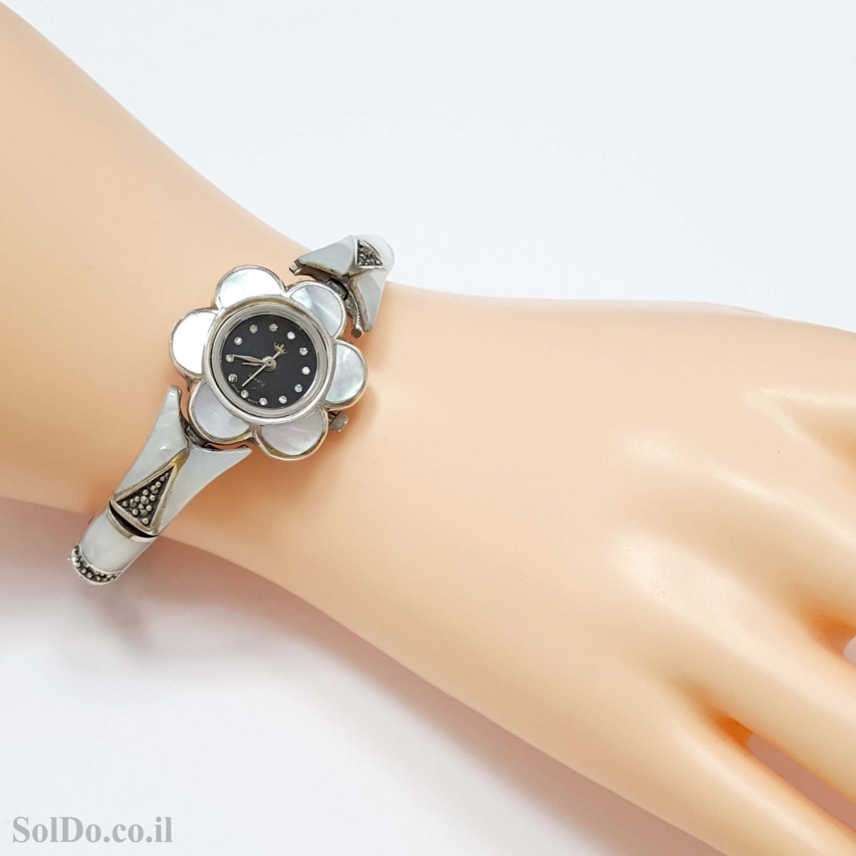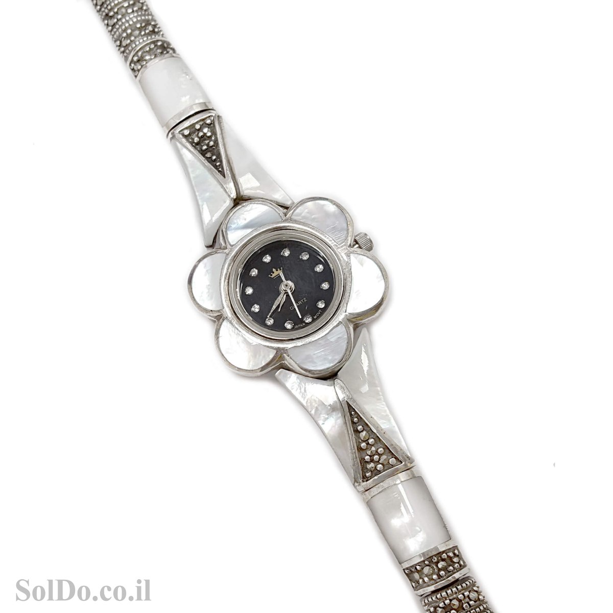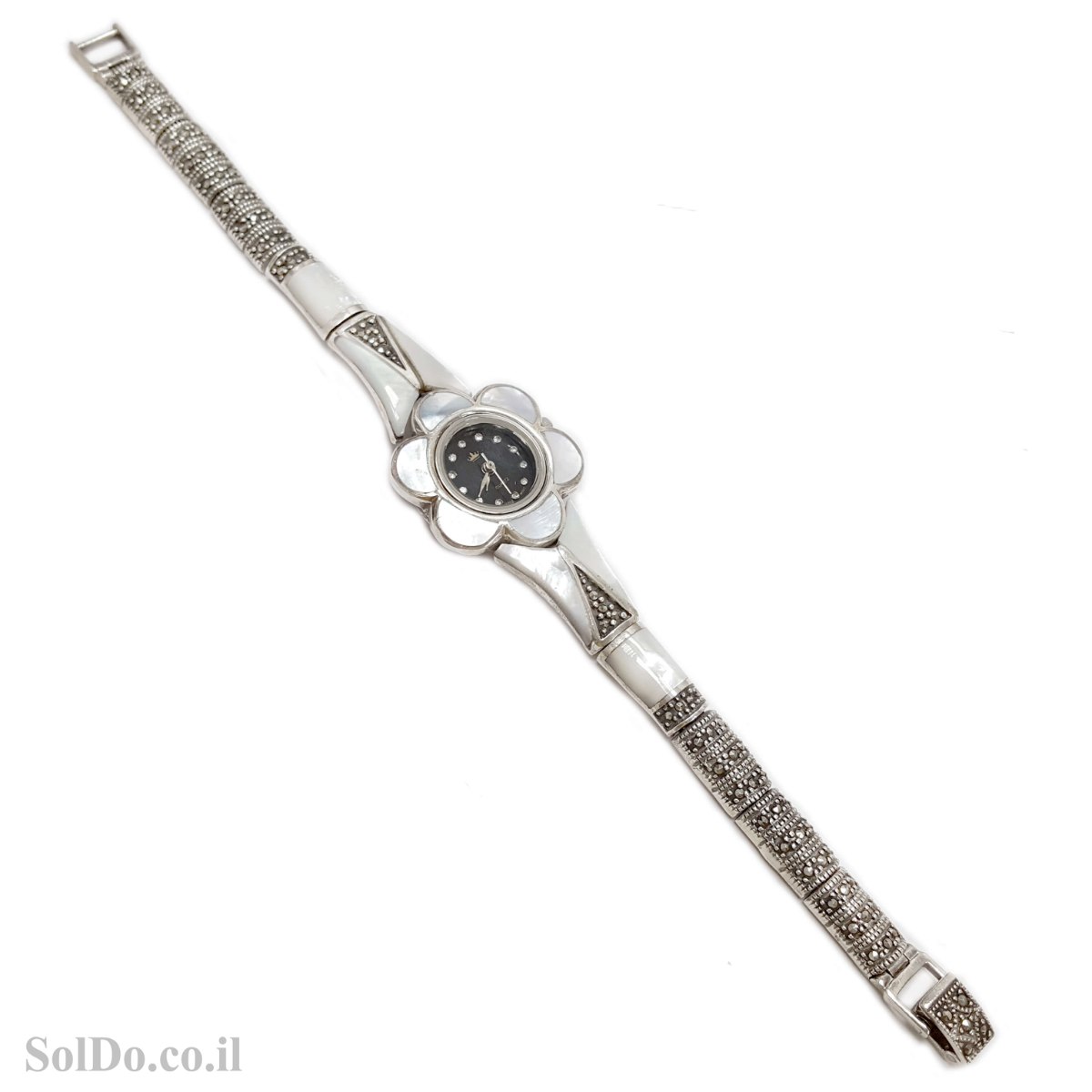 שעון מכסף מעוצב צדף לבן משובץ מרקזטים (Marcasite) .