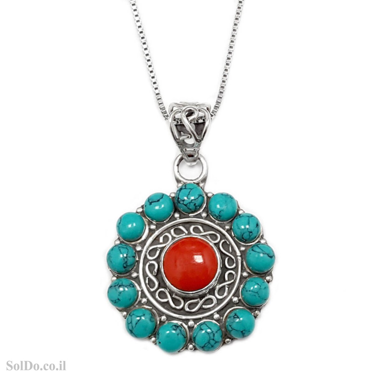תליון מכסף מעוצב משובץ אבני טורקיז וקורל אדום T6204 | תכשיטי כסף